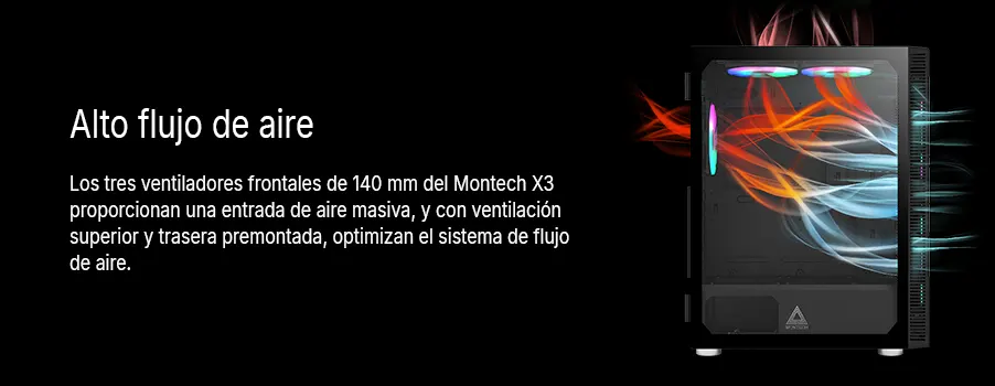 • Alto flujo de aire: los tres ventiladores frontales de 140 mm del Montech X3 proporcionan una entrada de aire masiva, y con ventilación superior y trasera premontada, optimizan el sistema de flujo de aire.
