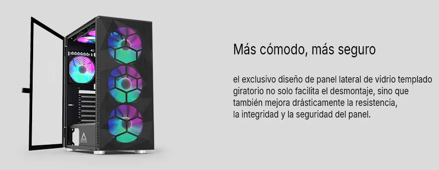 • Más cómodo, más seguro: el exclusivo diseño de panel lateral de vidrio templado giratorio no solo facilita el desmontaje, sino que también mejora drásticamente la resistencia, la integridad y la seguridad del panel.