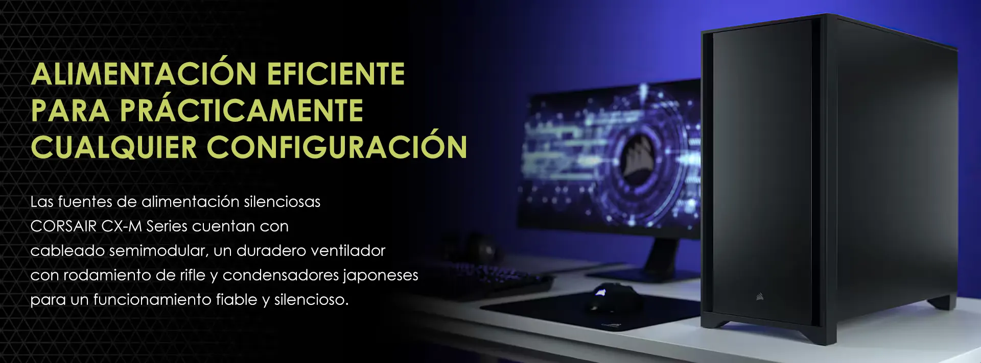 Las fuentes de alimentación silenciosas CORSAIR CX-M Series con conectores únicos EPS12V ofrecen cableado semimodular, un duradero ventilador con rodamiento de rifle y condensadores japoneses para un funcionamiento fiable y silencioso. Con una eficiencia máxima superior al 85 %, CX-M produce menos ruido y calor, lo que implica a su vez menos tiempo de preocupaciones y más para dedicar al juego. Y con solo 140 mm de longitud, la CX-M Series ofrecen una gran flexibilidad en los montajes.
